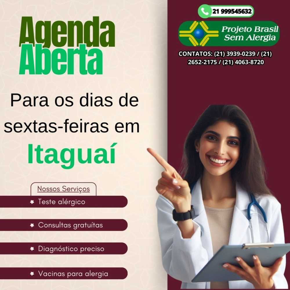 A partir de abril de 2025, o Brasil Sem Alergia terá mais um dia de atendimento em Itaguaí ! Agora, estaremos disponíveis também todas as sextas-feiras para oferecer diagnóstico, testes alérgicos e tratamento especializado para quem sofre com alergias.
